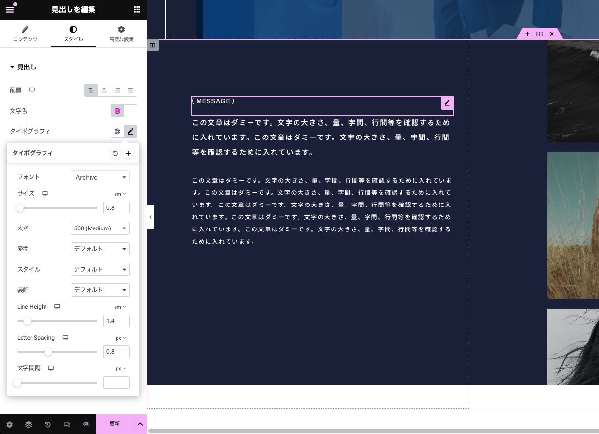 引き続き、見出しのウィジェットについて、このページでは見出しウィジェットの [スタイル] タイポグラフィの設定についてご紹介します。改めて、タイポグラフィ内で設定できることはこちらです。
