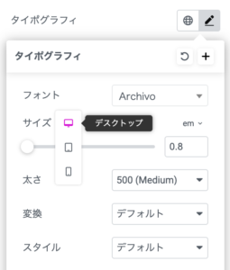 font-weightはここで変更できます。基本的には500(Medium) が多いかと思いますが、ページの見出しでの使用か、装飾としての使用、本文としての使用など用途によって合わせます。また、フォント選択によっても印象が変わるので、フォントを選び直したときには合わせて太さも変更します。