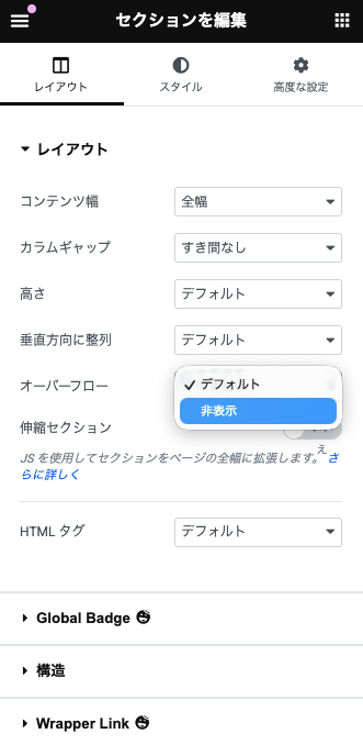 セクションのレイアウト – オーバーフロー – デフォルトを→「非表示」に変更