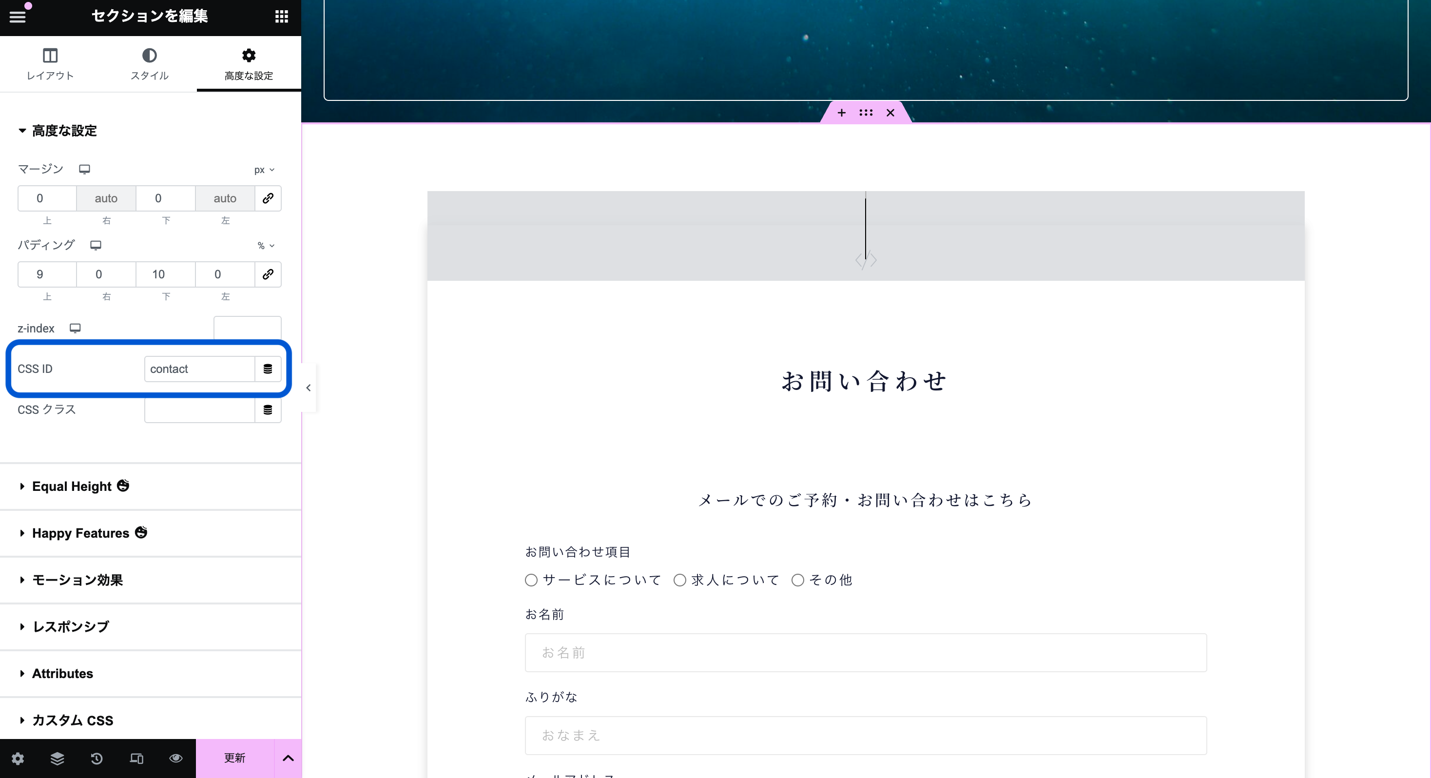 移動したい先のコンテナやセクション、見出しなどのウィジェットを選択し、[ 高度な設定 ] → [ CSS ID ] の欄に好きな名前を半角英数で入力します。