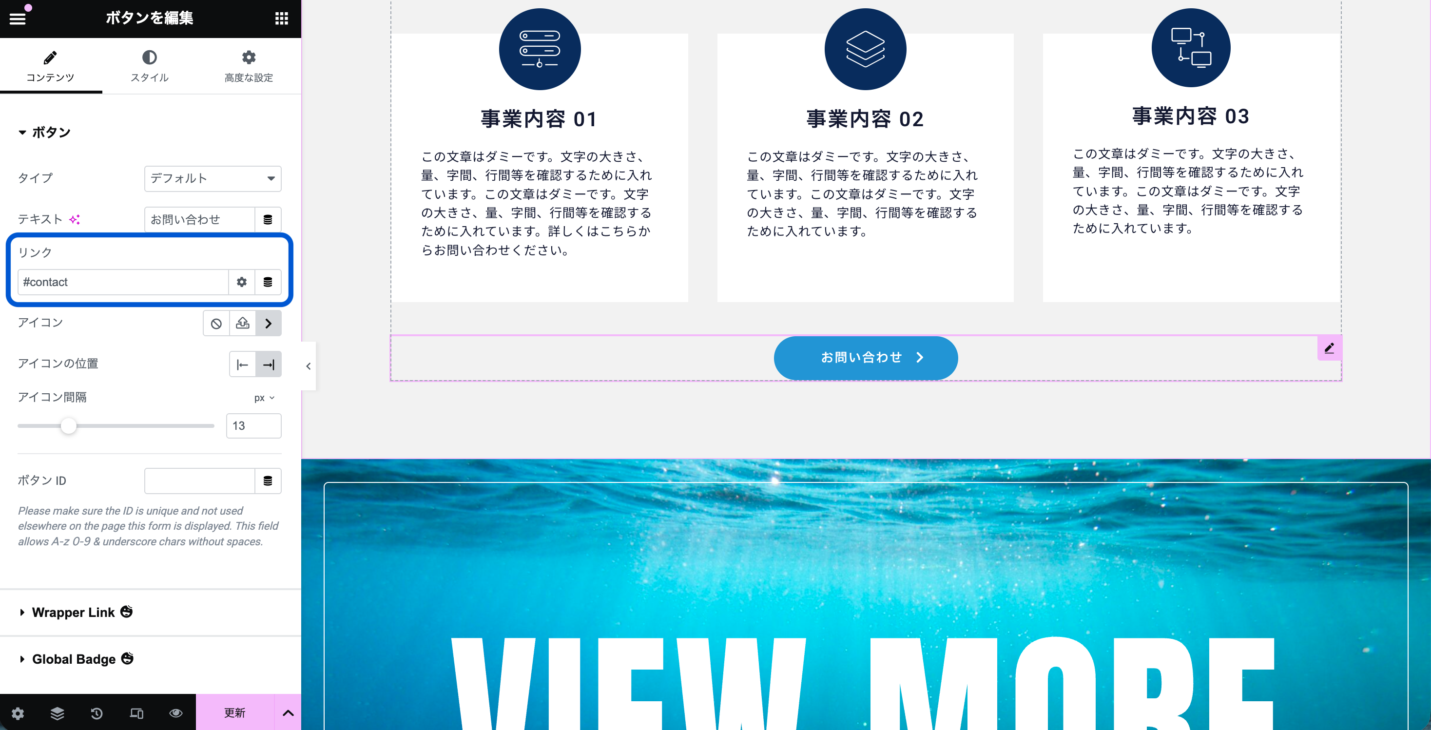 お問い合わせボタンを押したら、ページ下部のフォームまで自動でスクロールして移動するといった動きを実装する際のElementorでの設定です。
